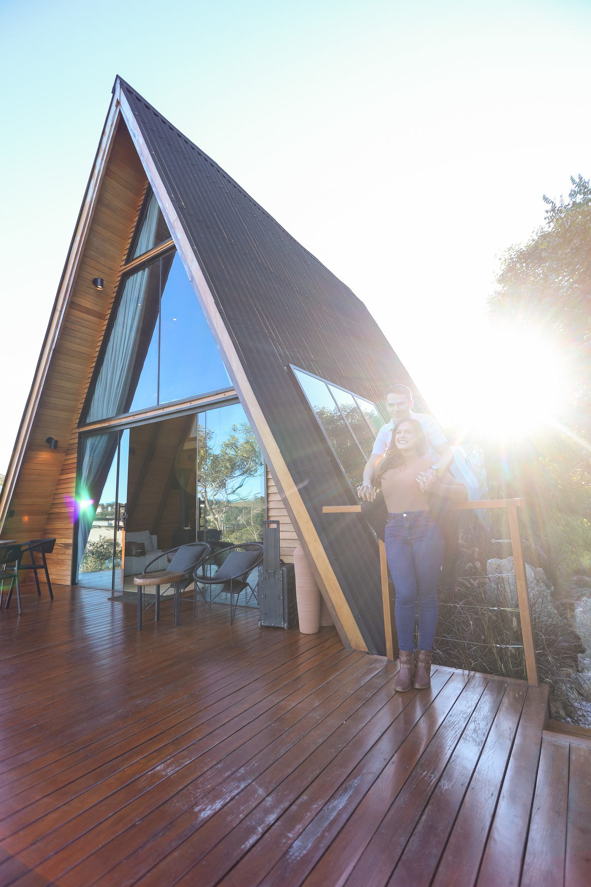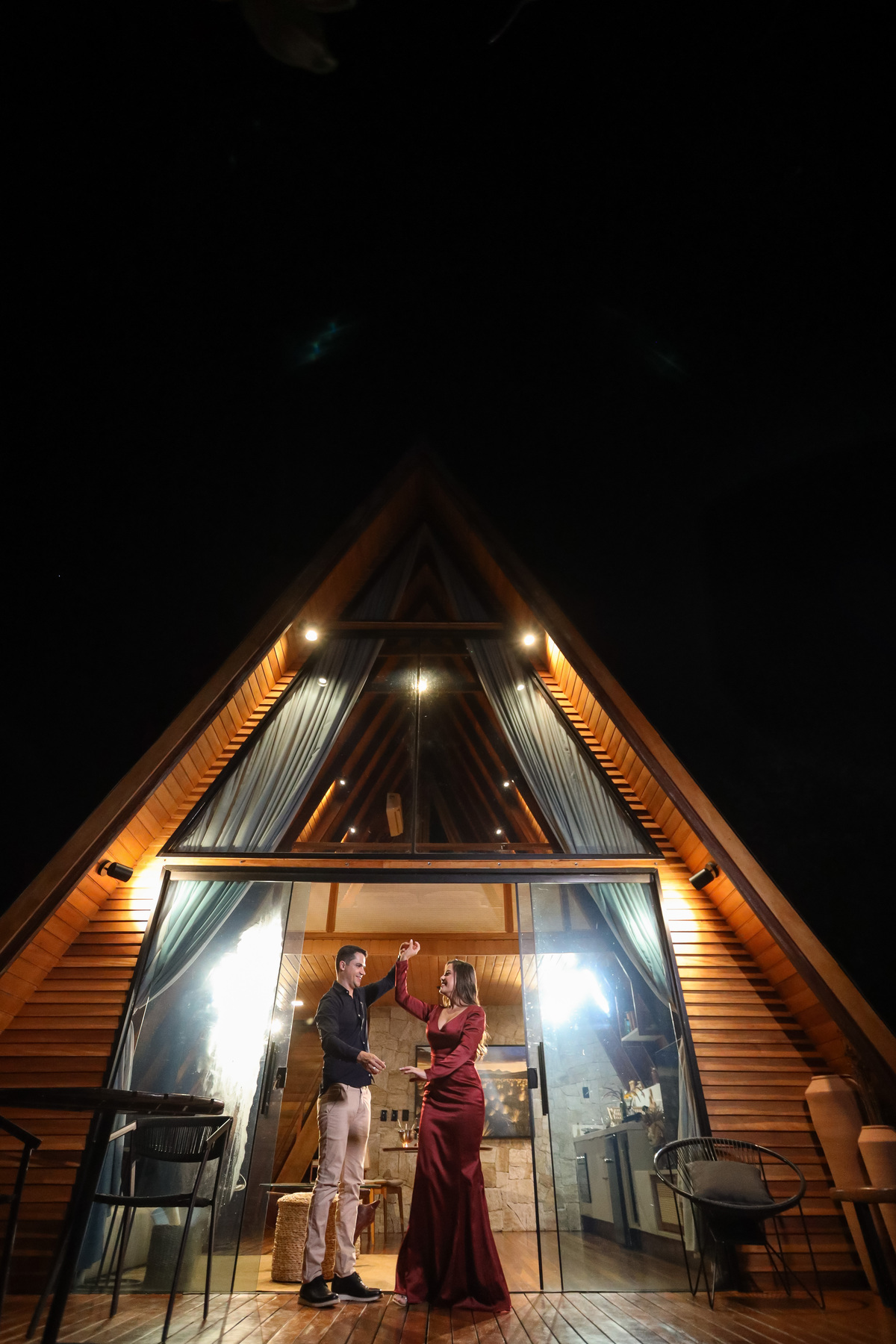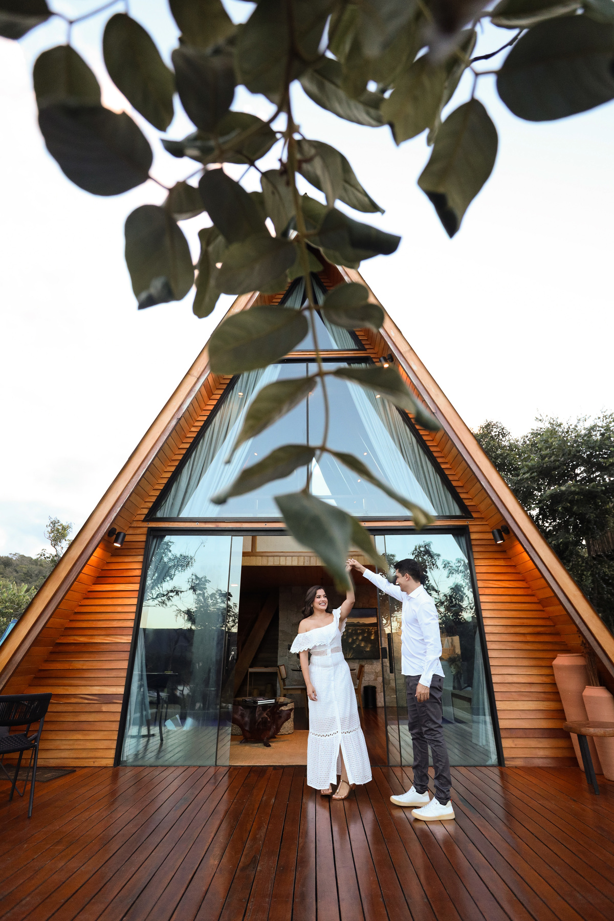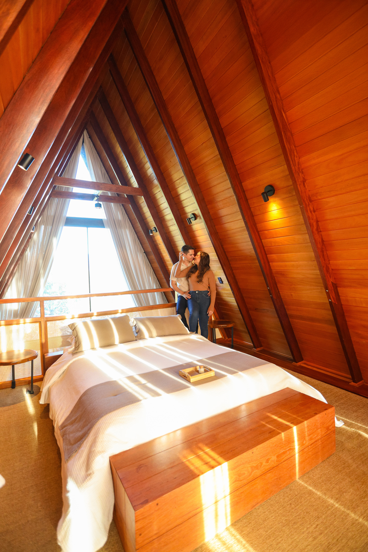 Durante o ensaio, aproveitamos a luz natural, a beleza da arquitetura da cabana e o clima leve do casal. As fotos capturam momentos espontâneos, olhares verdadeiros e sorrisos de quem está prestes a viver o grande dia.